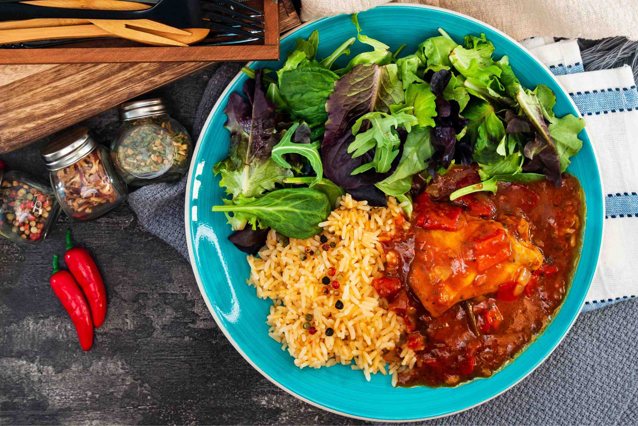 varená ryža, bageta alebo pečené zemiaky na podávanie
