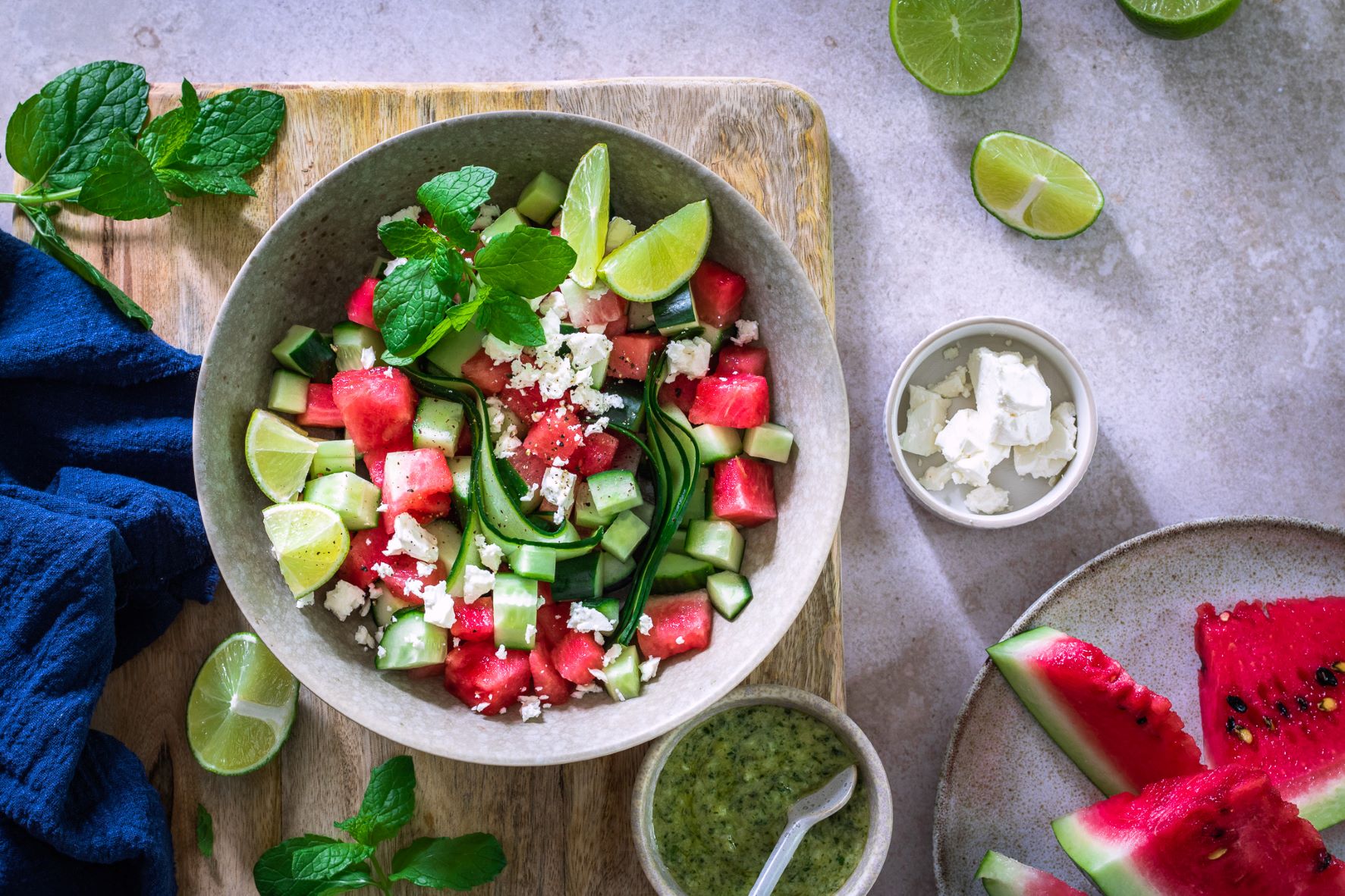 Zdá sa vám kombinácia melónu a uhorky málo osviežujúca? Keby áno, pre všetky prípady je tento šalát doplnený doslova explóziou osvieženia, a to v podobe mätového dipu s limetkou a mandľami.