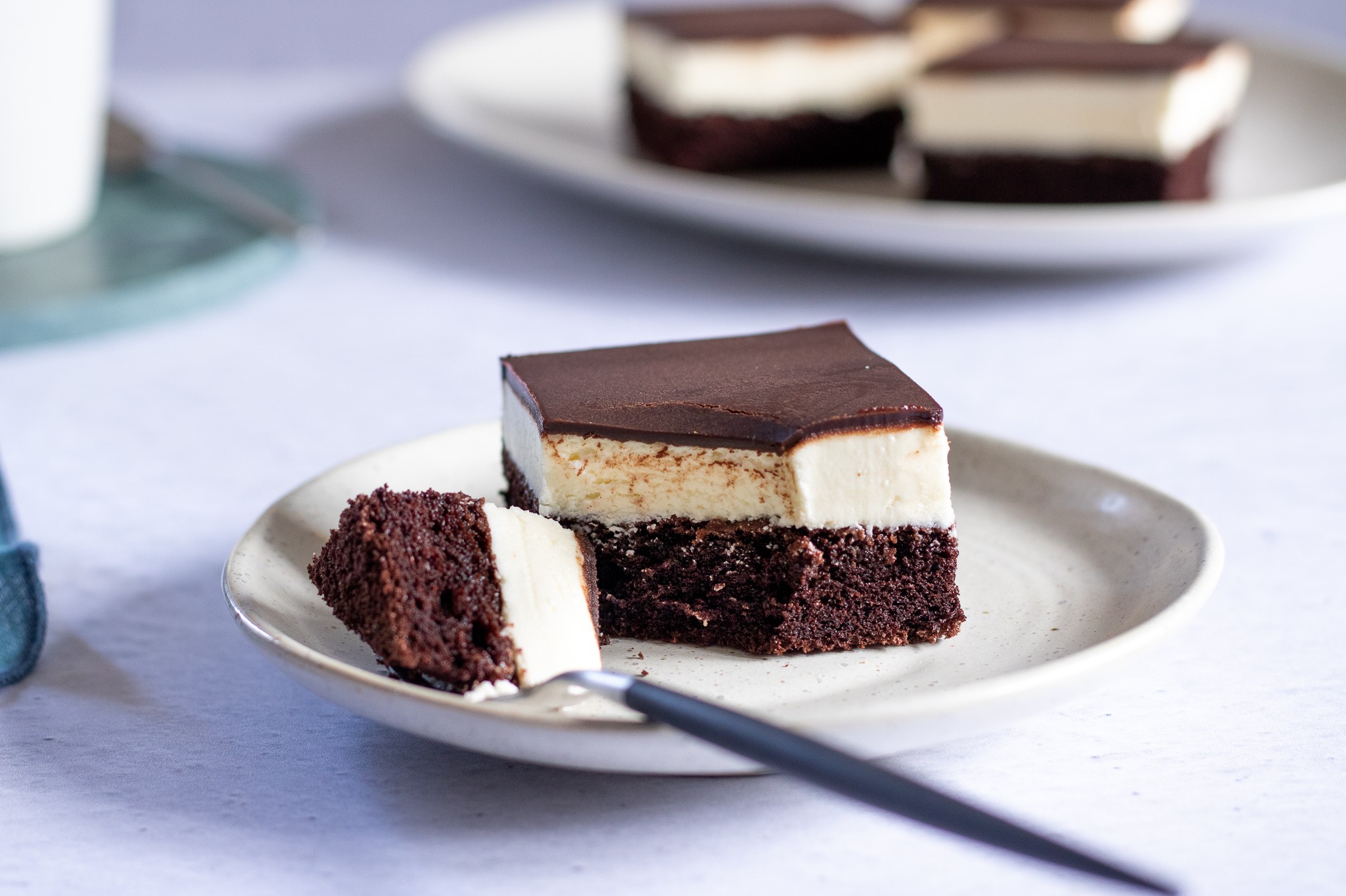 6. Čokoládu rozpusťte vo vodnom kúpeli. Vmiešajte na kocky pokrájané maslo a smotanu a nechajte rozpustiť. Polevu rozlejte po povrchu dezertu, uhlaďte a nechajte vychladnúť.