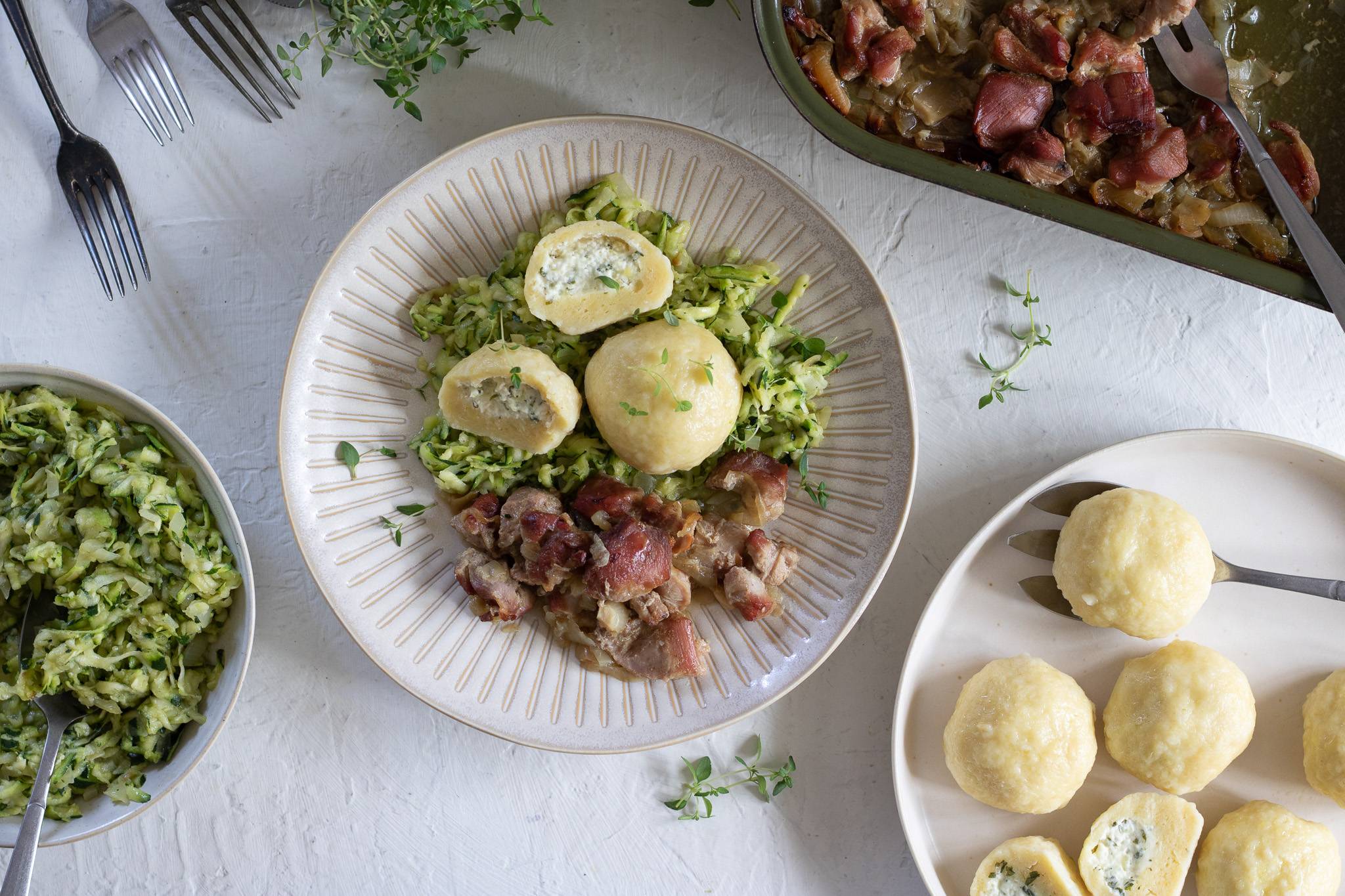 Morčacie pečené mäso so zemiakovou knedľou plnenou bylinkovou plnkou a cuketová kapusta