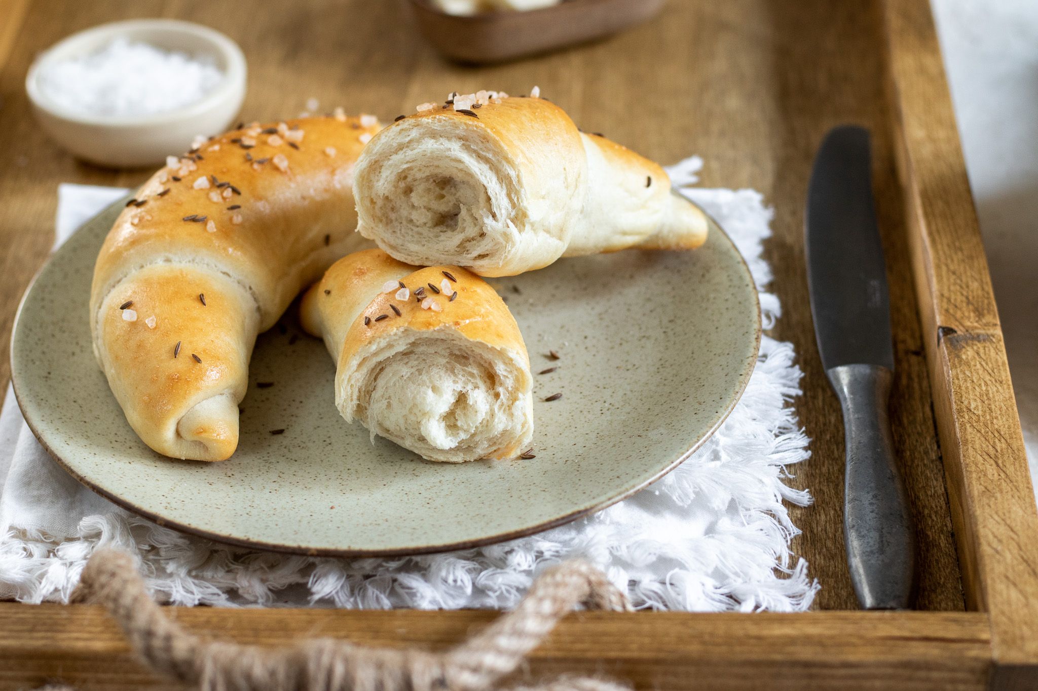 6. Potrite rozšľahaným vajcom zmiešaným s trochou mlieka. Posypte ľahko rascou a soľou a pečte pri 210 °C 15-20 minút dozlata.