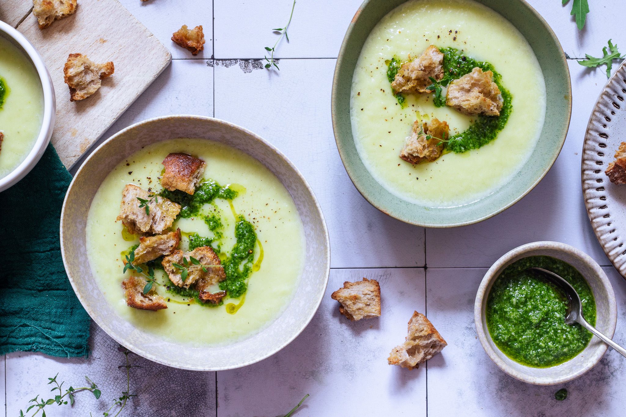 8. Polievku naservírujte do tanierov alebo misiek. Pokvapkajte podľa chuti pestom, posypte krutónmi a okoreňte.