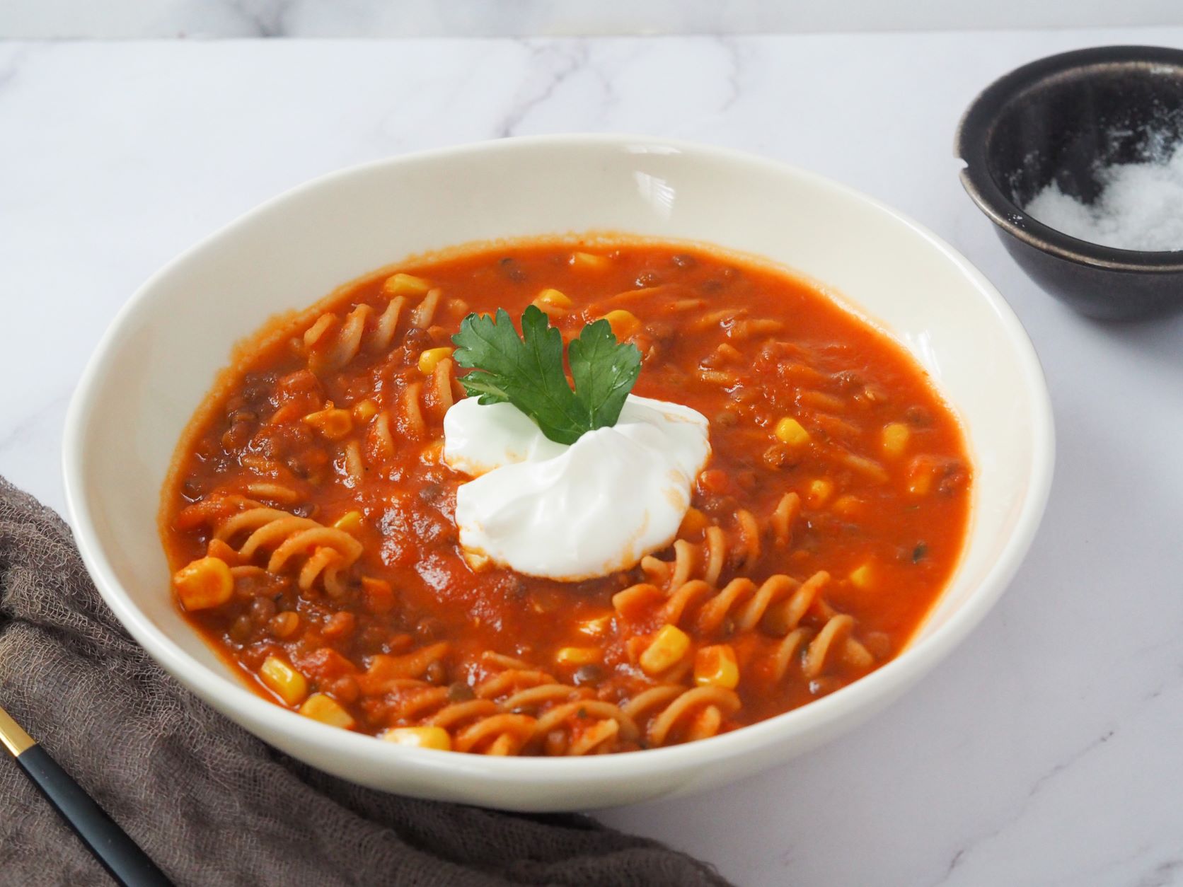 3. Rozmixované rajčiny prelejte do hrnca. Vmiešajte šošovicu a cestoviny a varte do zmäknutia.