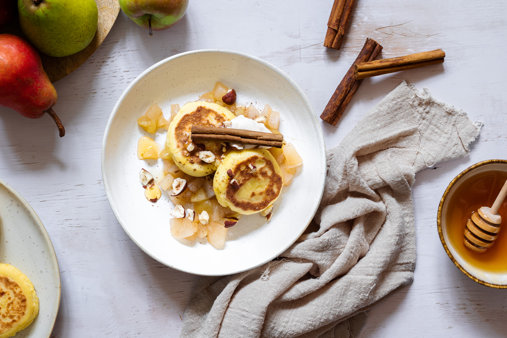 6. Syrniki podávajte s kompótom, kyslou smotanou alebo jogurtom, orechmi podľa chuti a medom alebo javorovým sirupom.