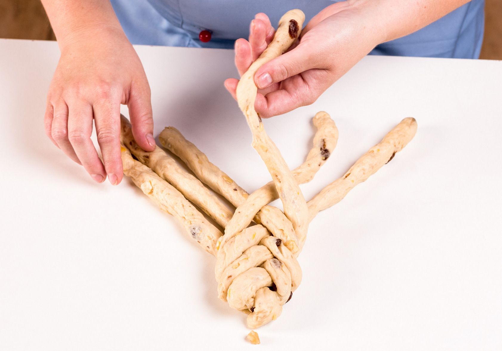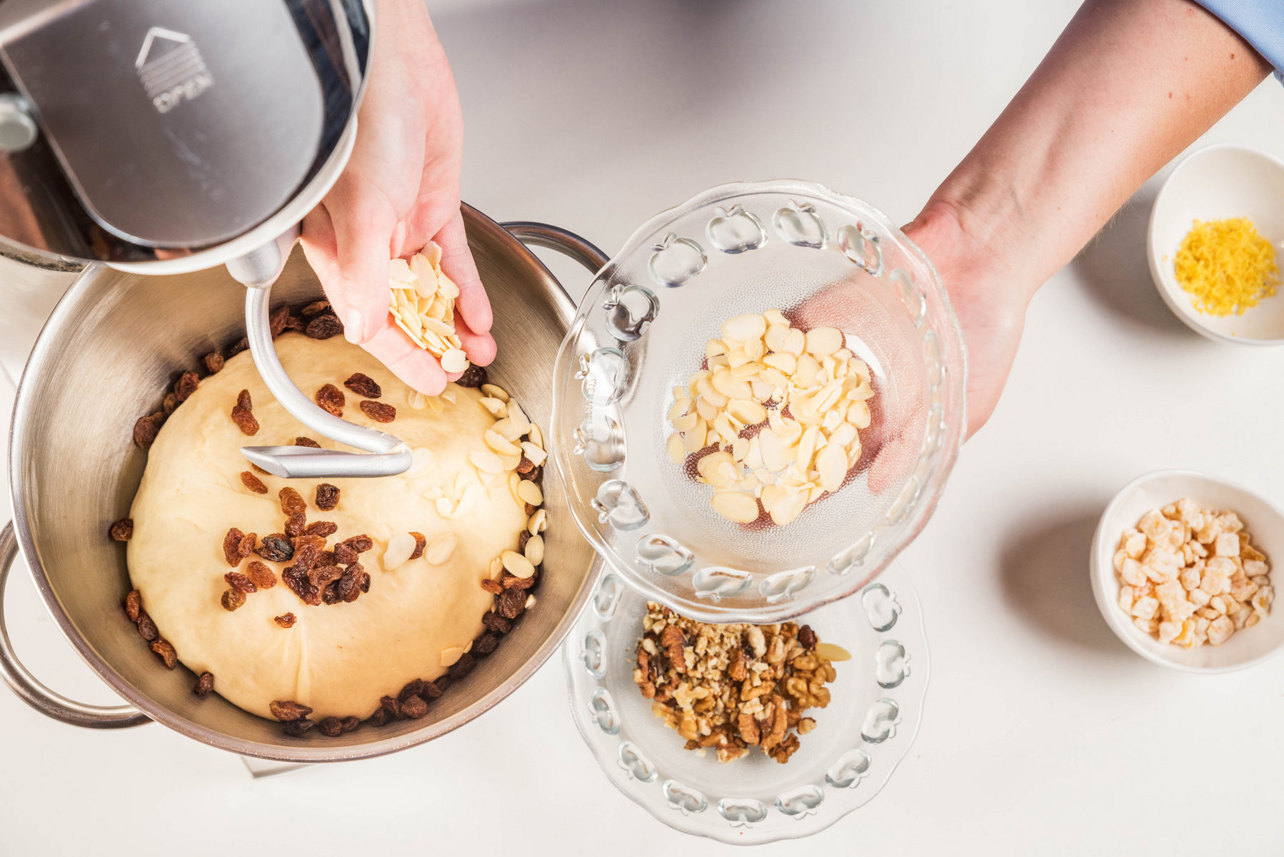4. Do vypracovaného cesta na záver pridajte ostatné suroviny: hrozienka, citrónovú kôru, vlašské orechy. Pokiaľ chcete mať vianočku skutočne bohatú, môžete pridať aj nastrúhanú pomarančovú kôru.