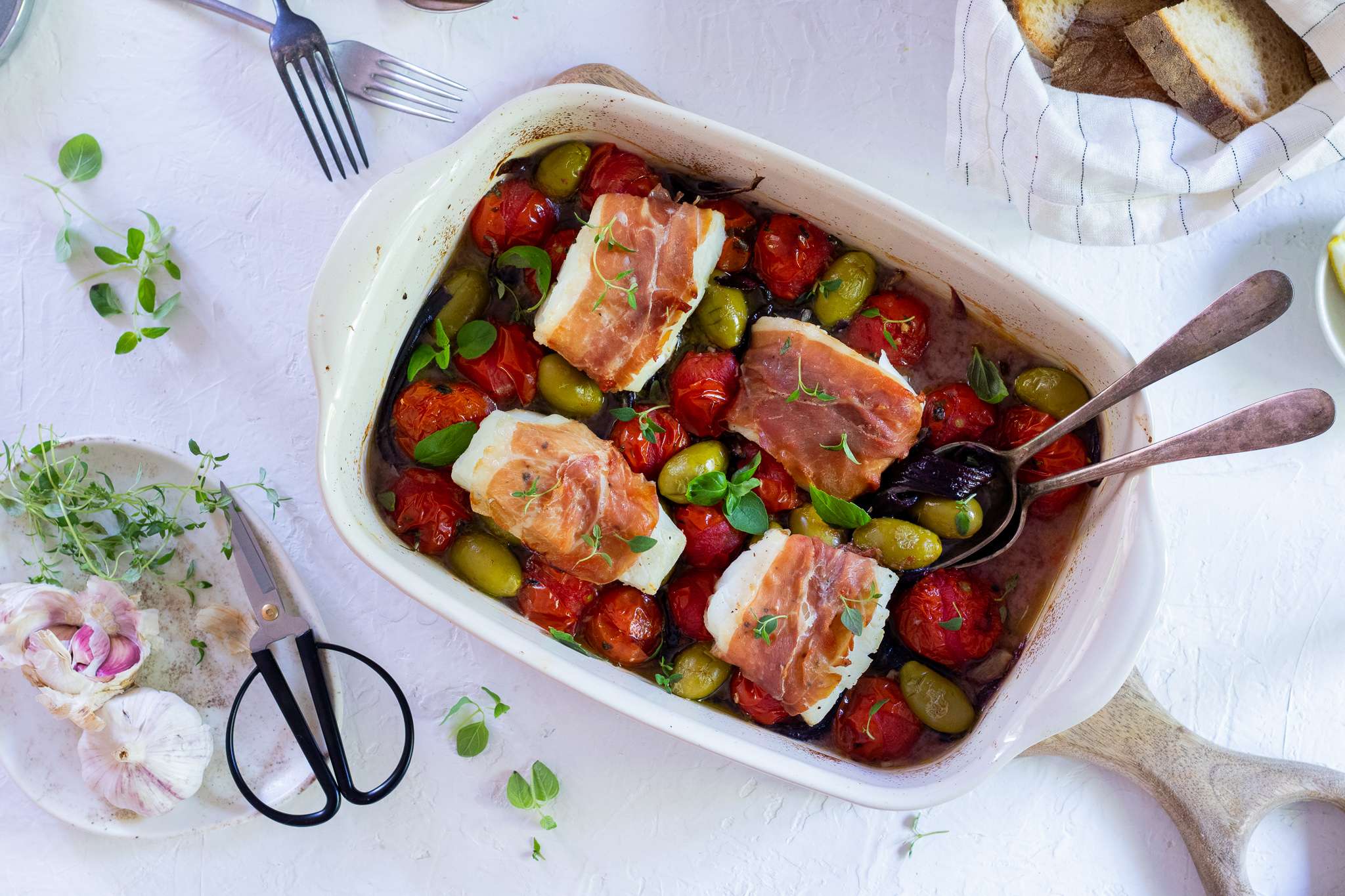 Treska v parmskej šunke pečená s rajčinami a olivami