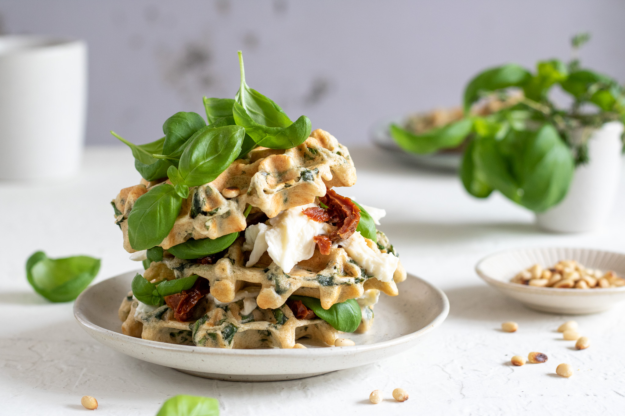 4. Vafle podávajte s natrhanou mozzarellou, sušenými rajčinami pokrájanými na pásiky alebo najemno, nasucho opečenými píniovými semienkami a čerstvou bazalkou.
