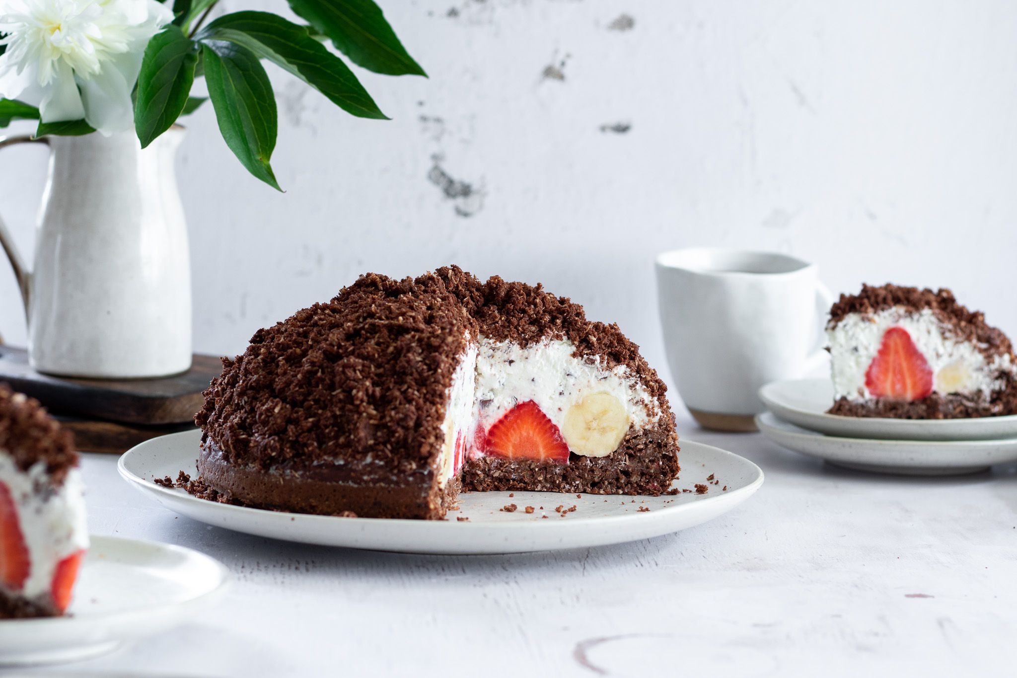 4. Korpus vyberte z formy a preložte na tanier. Lyžicou vydlabte z korpusu kruh asi do polovice výšky, pričom si ponechajte asi 2 cm okraja. Vydlabaný korpus rozmrvte.