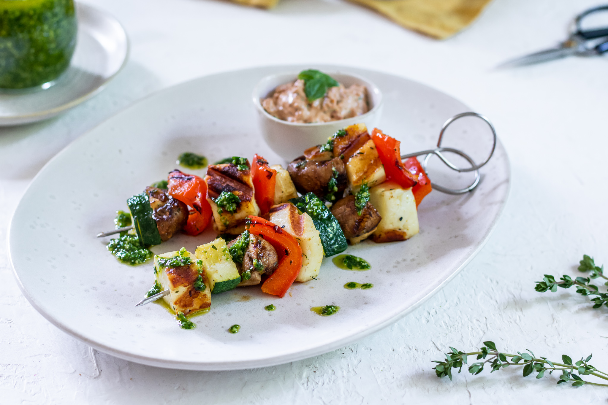 Zeleninové špízy s halloumi, špenátovým pestom a rajčinovým dipom